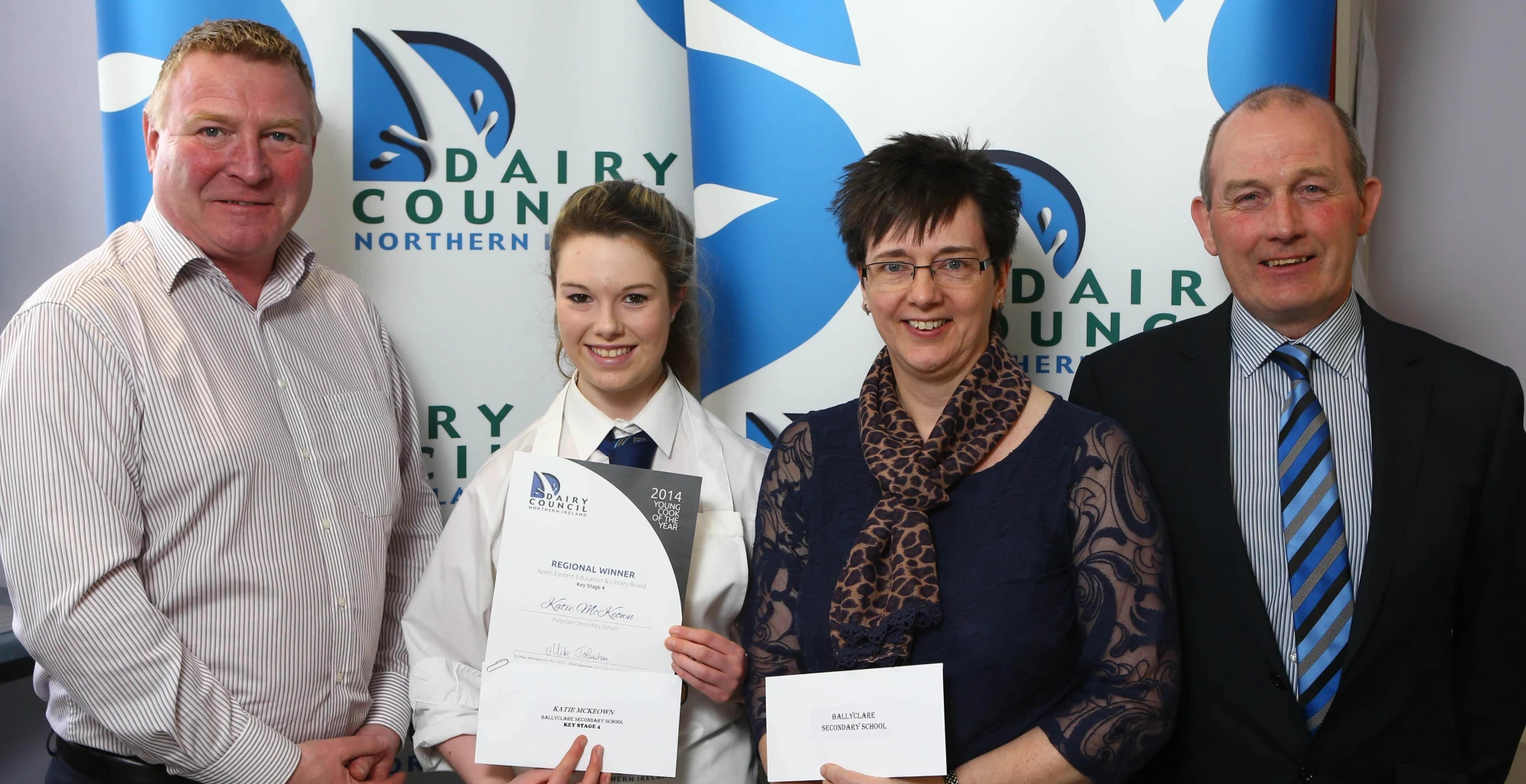 Harry O’Neill, DCNI Chairman; Elizabeth Cathcart YCY winner; Jim Gracey, Sports Editor Belfast Telegraph