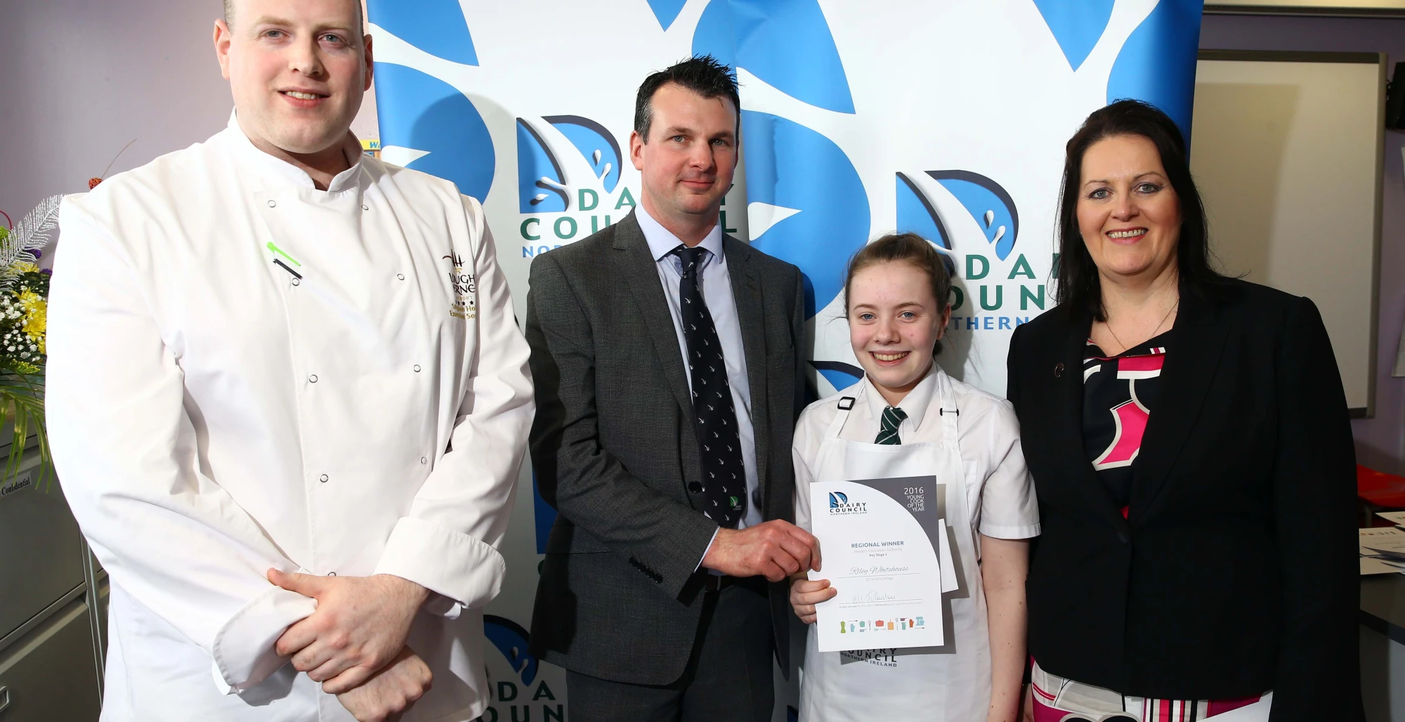 Olivia Miskimmons with chef Stephen Holland and DCNI vice–chair Mark Blelock