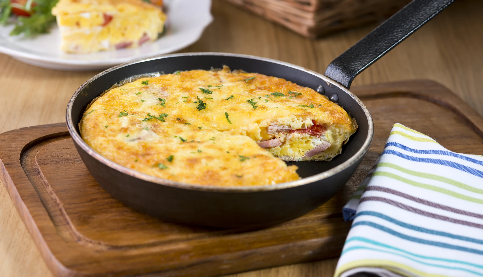Simply arrange the tomato and ham chunks into a flan dish, whisk the eggs and pour into the dish, top with grated cheddar cheese.