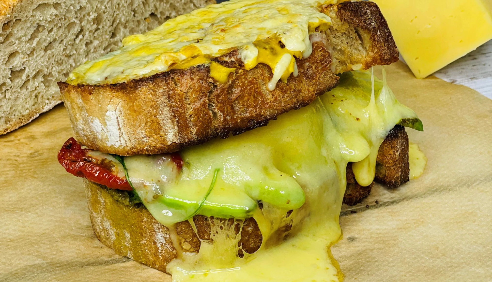 Top with rocket, sundried tomatoes and cheddar slices. If you’re adding ham to your toastie, place the slices under the cheddar at this point too.