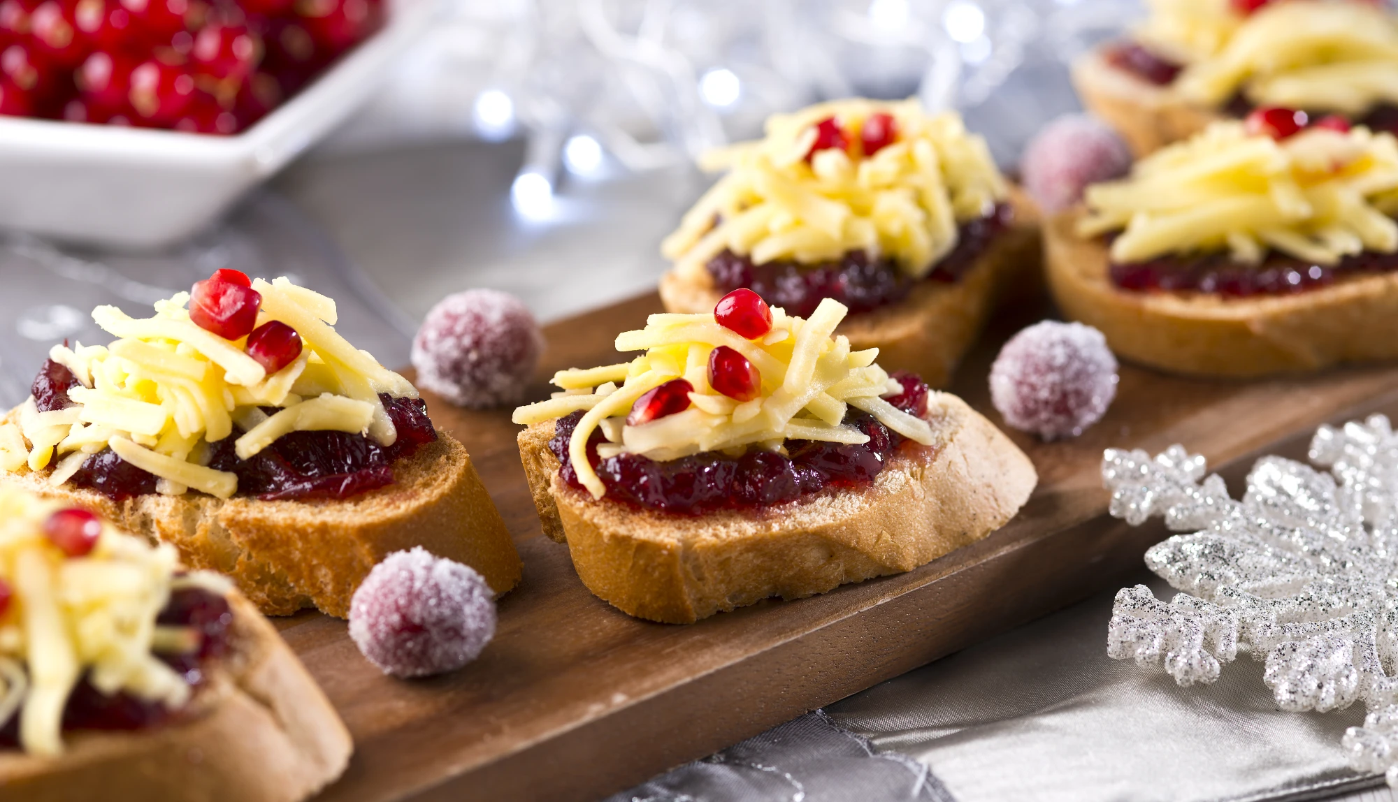 Preheat a grill and toast the bread on both sides until golden and spread with butter. Top the hot toast with cranberry sauce, grated cheddar and sprinkle with pomegranate seeds.