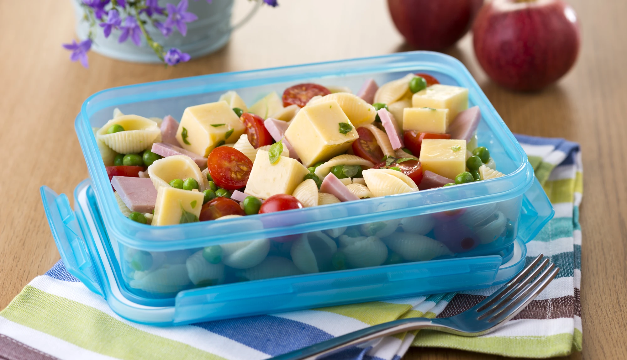Stir in ham chunks, cheddar cubes, peas, cherry tomatoes, vinaigrette and season with salt and pepper.