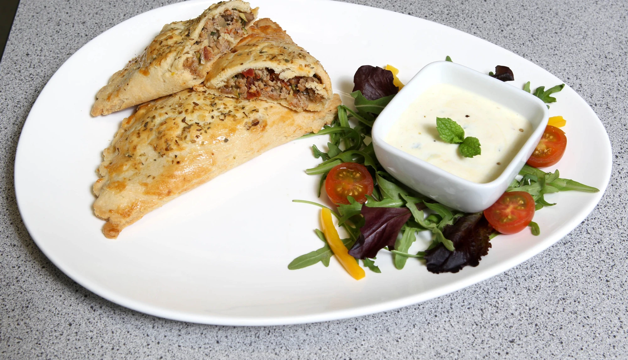 Serve with salad leaves, cherry tomatoes, pepper and the natural yogurt dip, garnished with sprigs of mint.