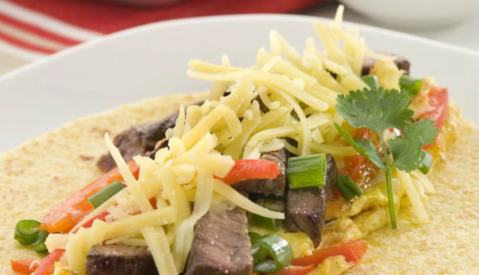 Take a tortilla and spoon in a quarter of the egg mixture.