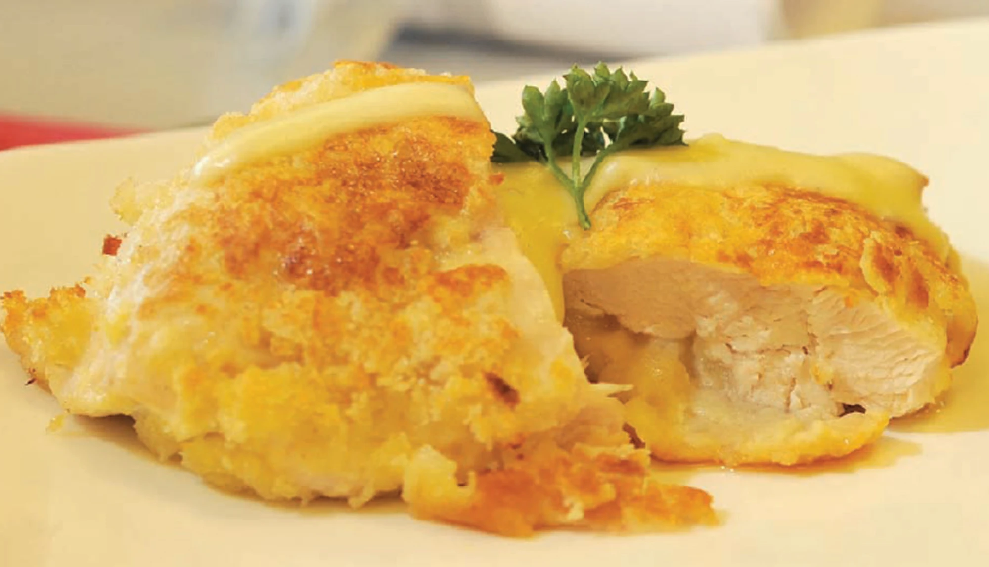 First, open your chicken fillet and stuff it with ham and some of the grated cheese.