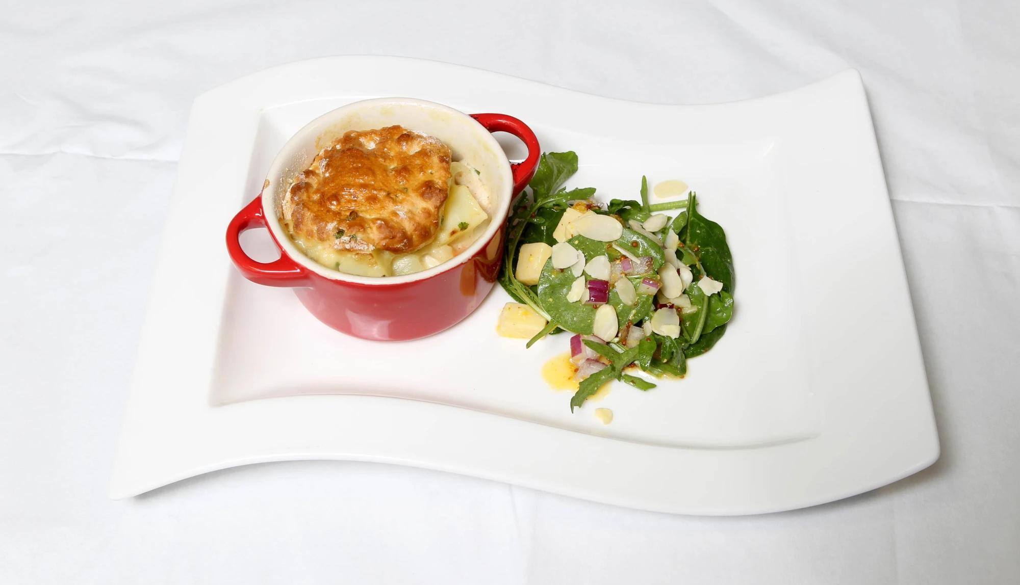 Pre–heat the oven to 220ºC / Gas mark 7. Divide the chicken filling evenly among 4 ovenproof dishes. Place a scone round on top of each pie and brush with beaten egg glaze. Bake the pies for 15 minutes. Reduce heat to 180ºC / Gas mark 4 and continue baking until the scone crust is golden and brown.