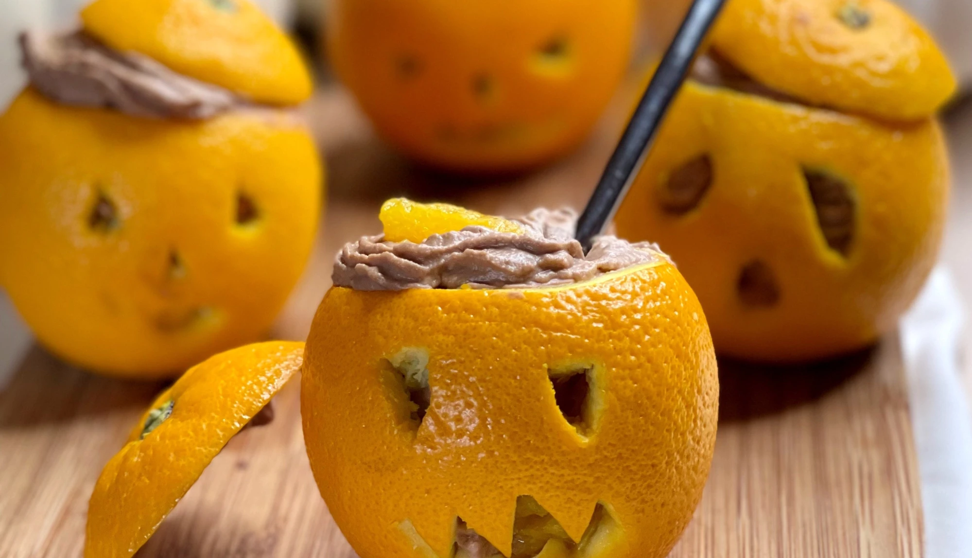 Spoon or pipe the mixture into the oranges and top with an orange segment and the lid of the orange