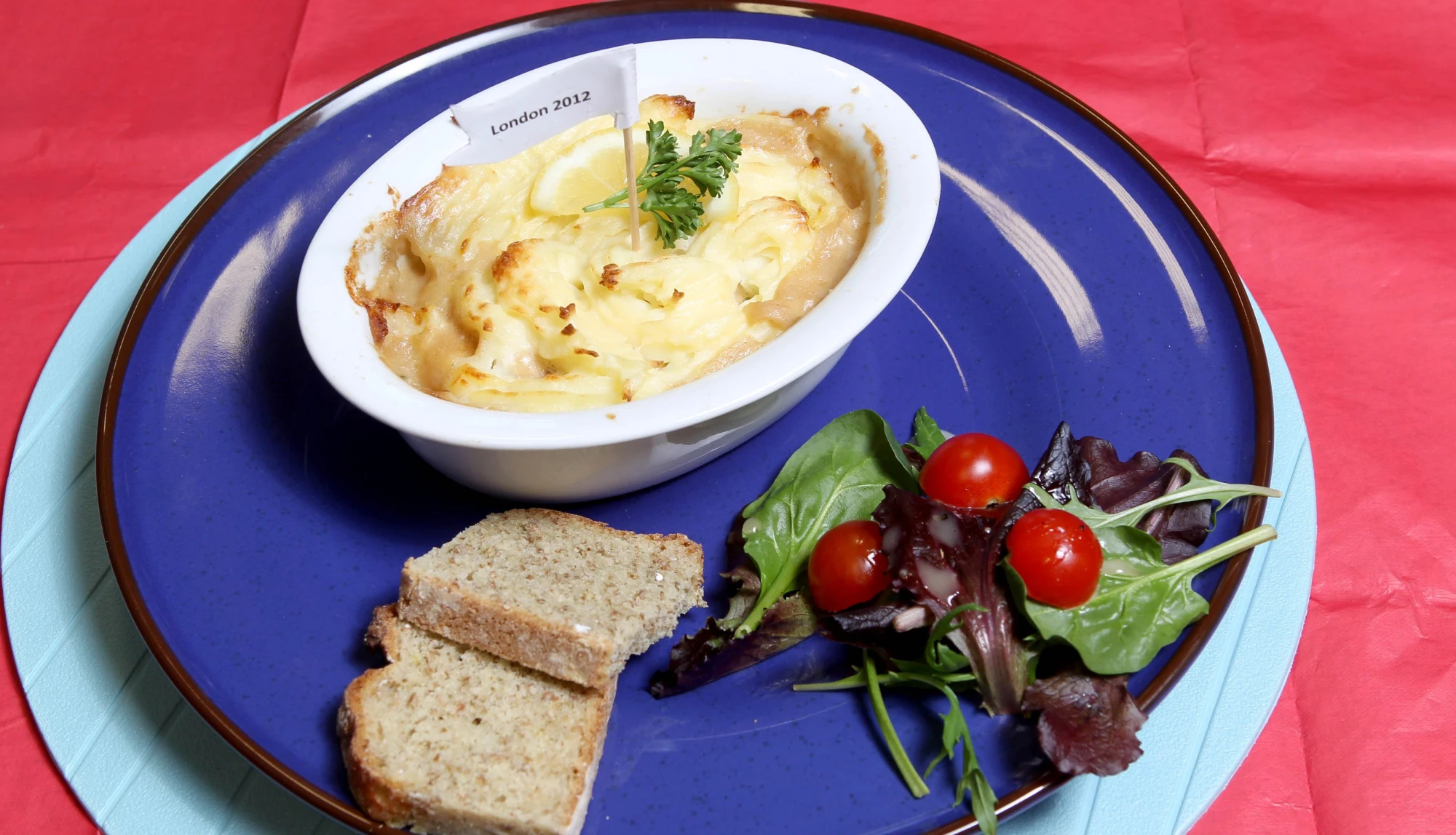 Remove the skin from and cut into 2 cm chunks. Divide all the fish and peas between 4 ramekins and pour over the sauce. Cover with mashed potato. Brush the potato topping with a little beaten egg.