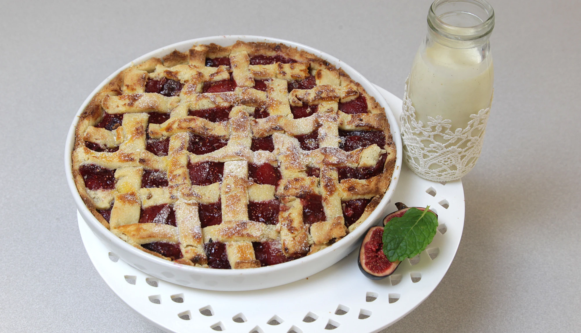 Put the custard into a small serving jug and place the mint leaf at the side of the pie. Dust the lattice pie and plate with icing sugar.
