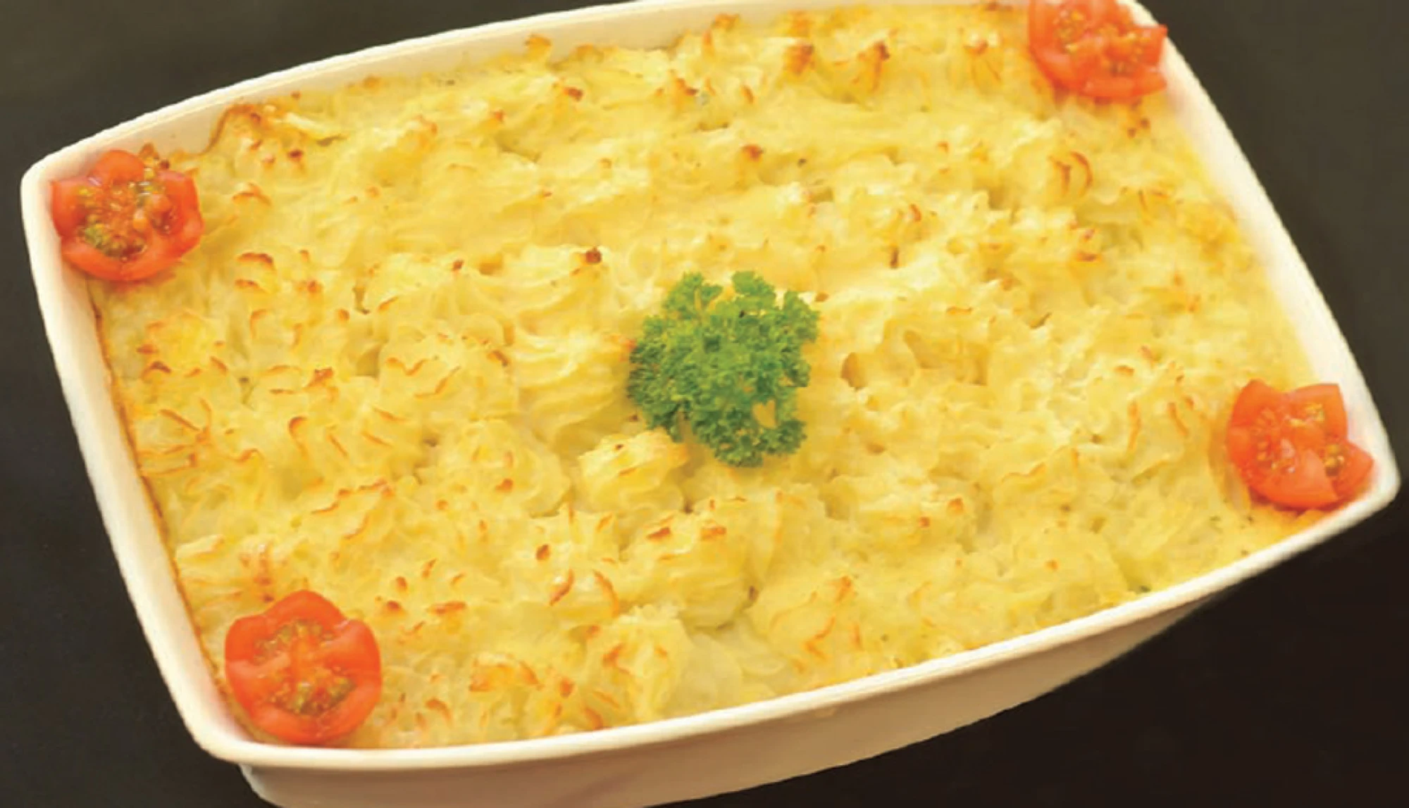 Bake in the oven at 200ºC (gas mark 6) for 10 – 15 minutes, until the potato is set. Brush the beaten egg over the pie, return to the oven and cook for a further 15 minutes, until golden brown.