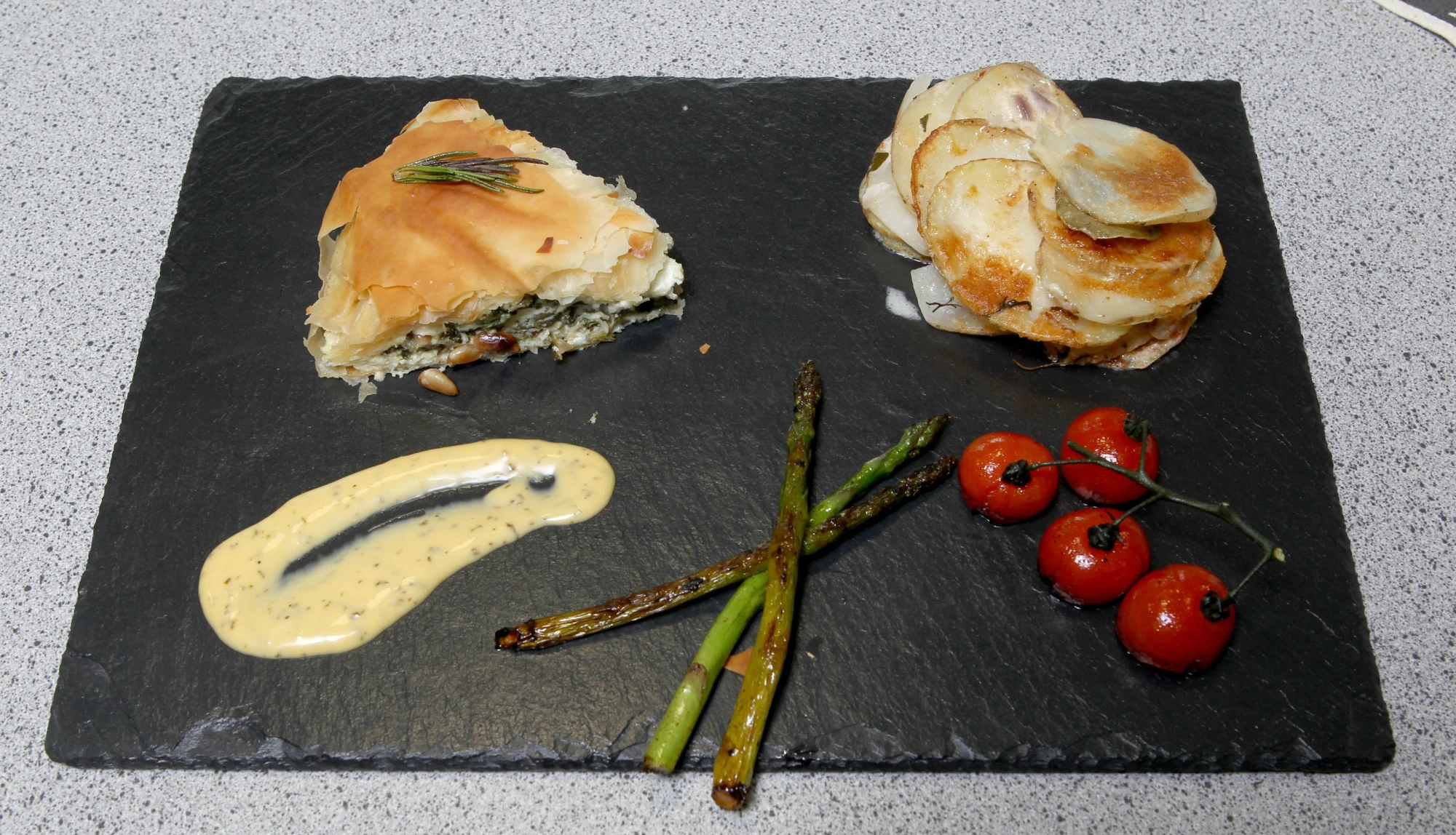 Serve the pie with Dauphinoise potatoes, local mixed vegetables, and crème fraîche.