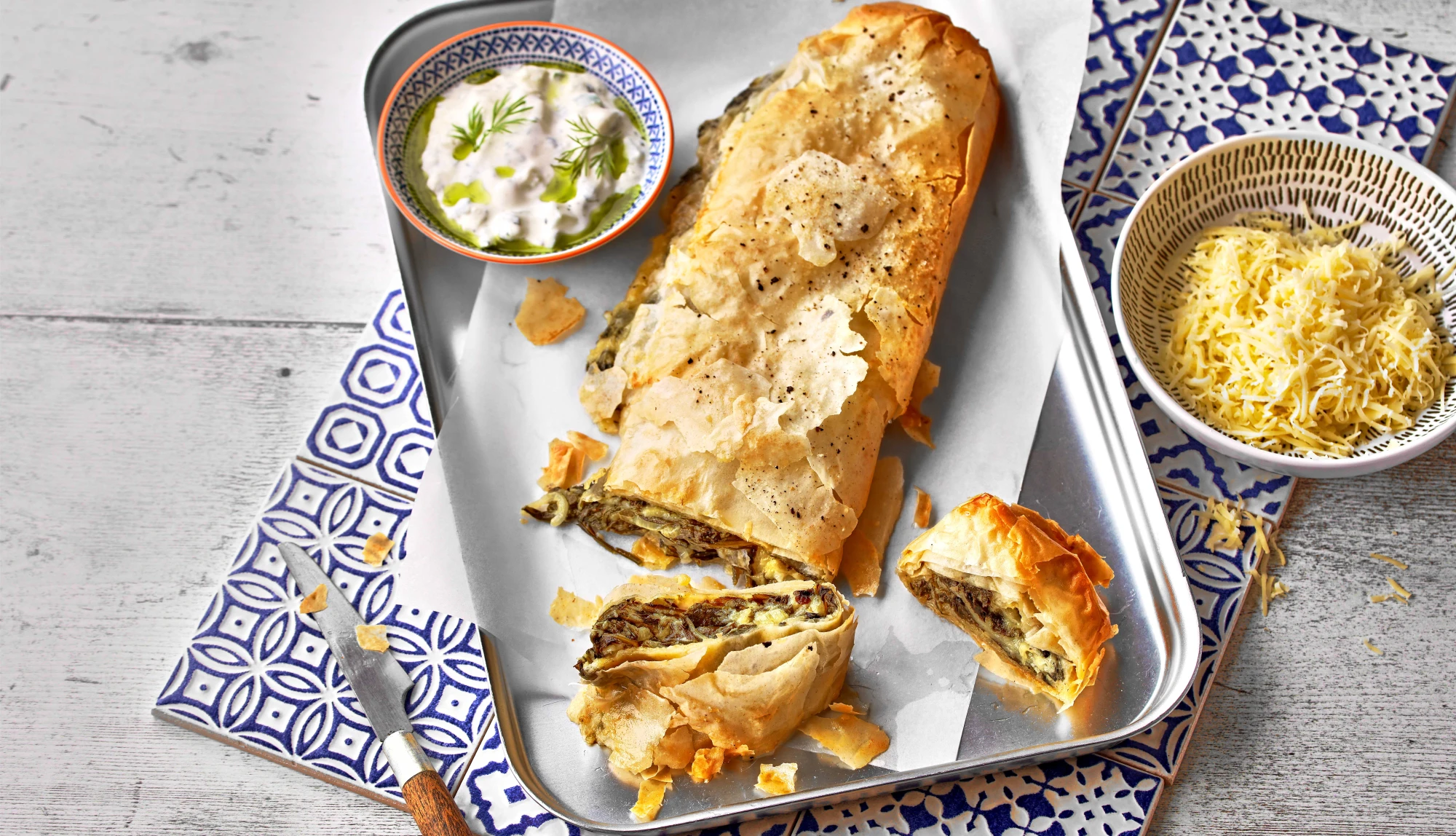 Place spanakopita on a baking tray lined with greaseproof paper and brush with olive oil.