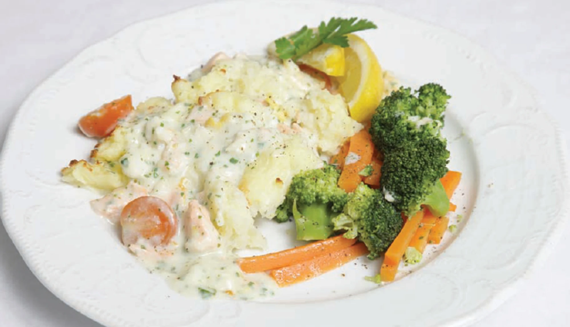 Place the fish, sauce and tomatoes into a baking dish. Spoon the mashed potato over the sauce, and bake for 20 minutes in the oven, until golden brown.