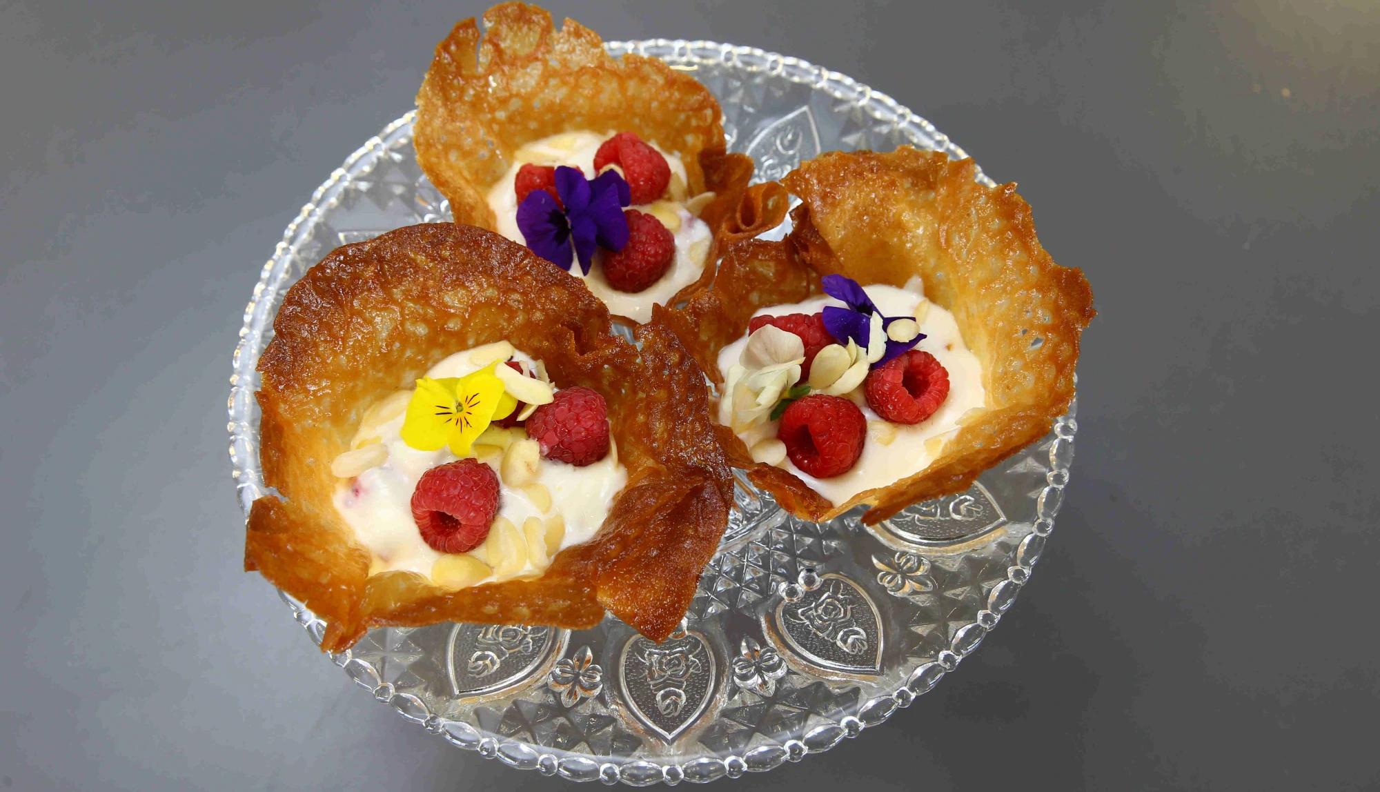 Fold in the fromage frais and the lemon curd and divide the mixture between the brandy snap baskets. Top with the remaining raspberries and serve.