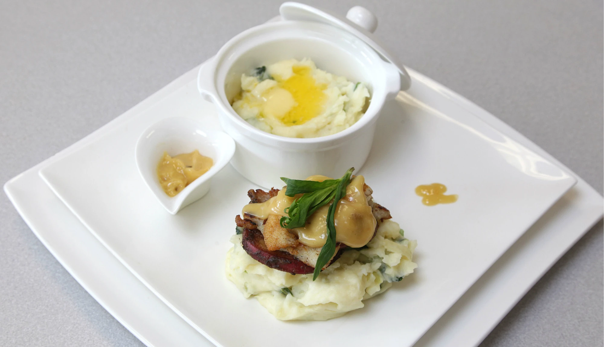 To make the colcannon mash, boil the potatoes in a saucepan until tender. Steam the cabbage for 3 to 5 minutes.When the cabbage is cooked, strain to remove any moisture. Add a third of the butter and cover.