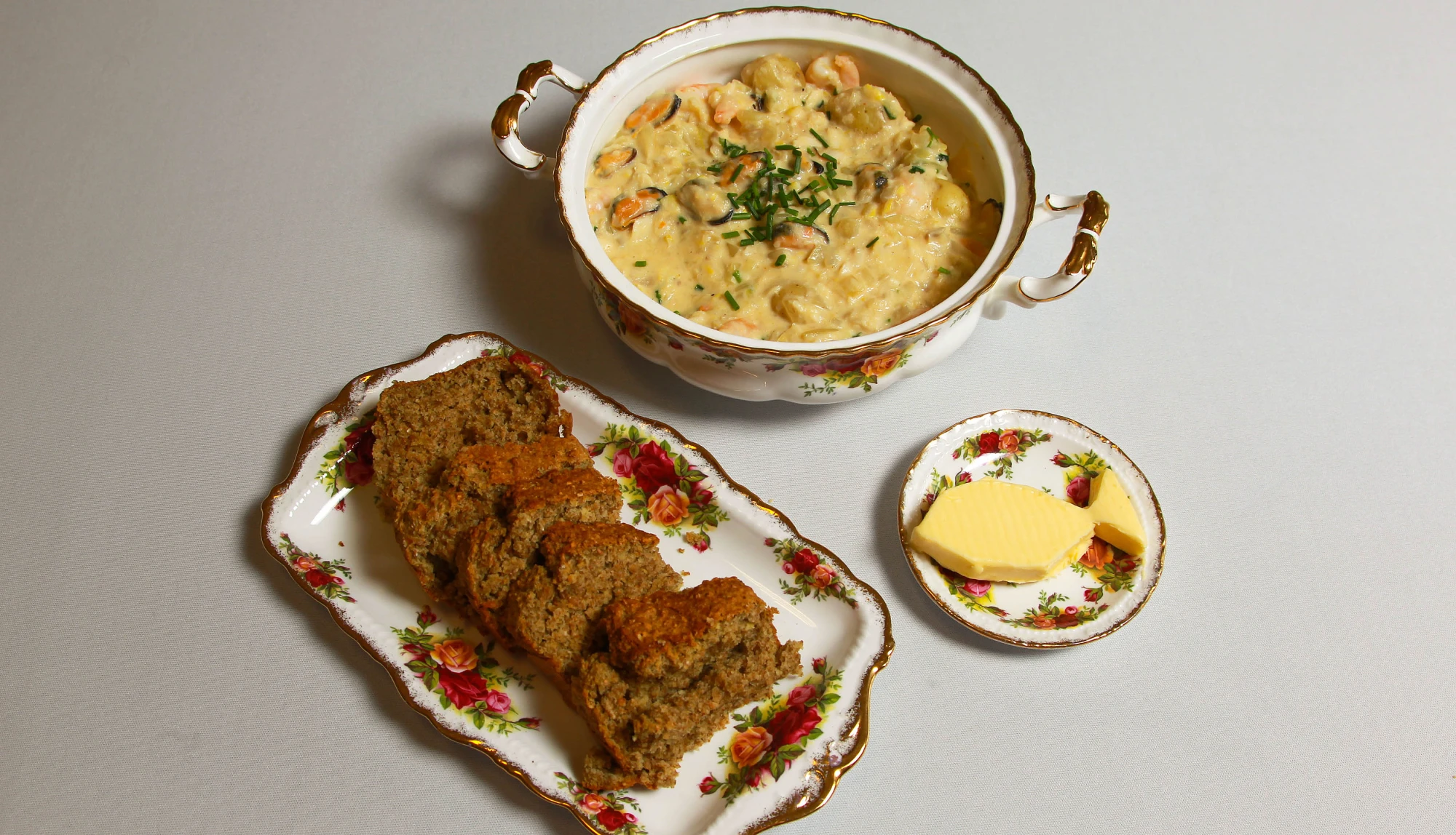 For the wheaten bread, pre–heat the oven to 200°C/gas mark 7 and grease a loaf tin.