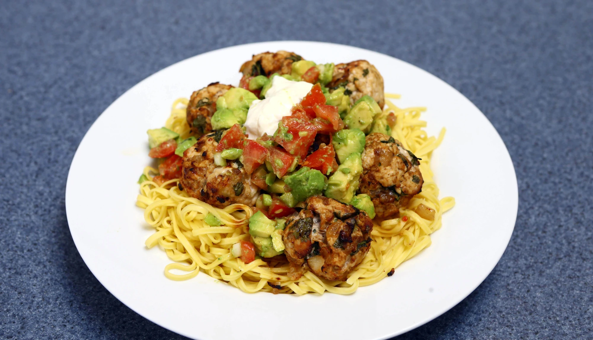 Serve with tagliatelle and top with salsa, grated cheese and sour cream.