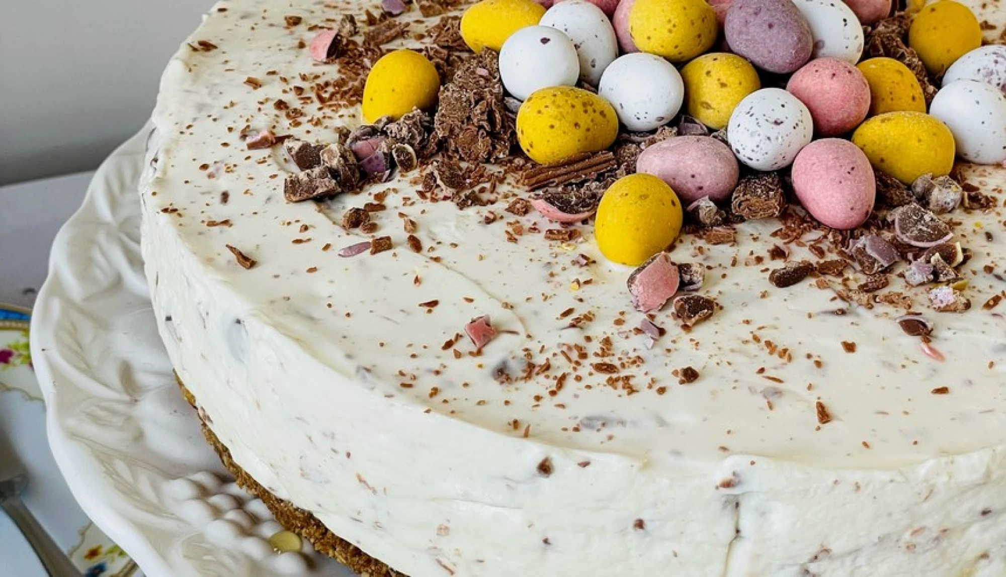 Pour onto the chilled biscuit base and spread out evenly. Chill in the fridge for at least 4 hours but preferably overnight. Remove from the tin onto a serving plate. Add the crushed flake and some mini eggs.
