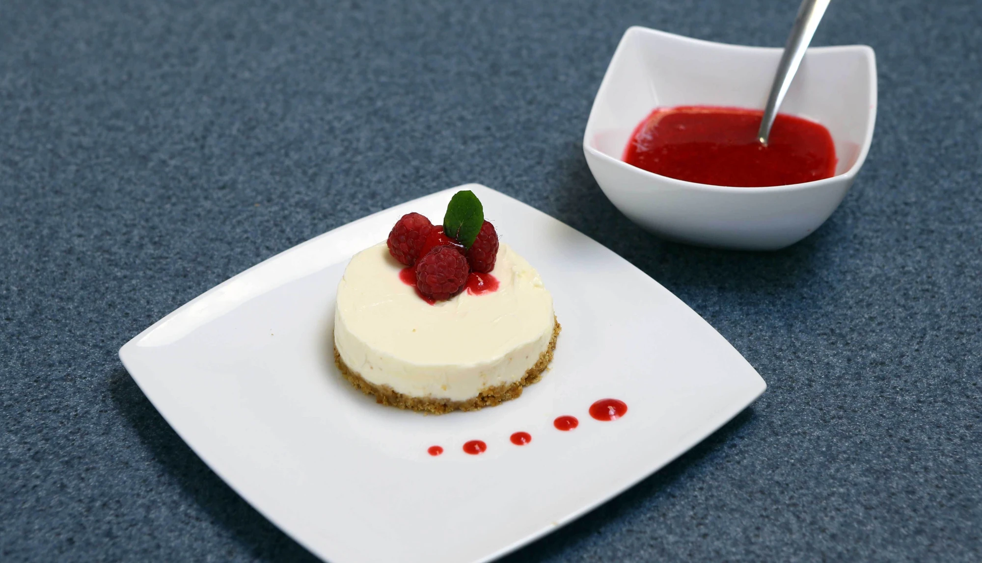 Remove the metal rings from the cheesecake, decorate with a few raspberries and serve with the coulis.
