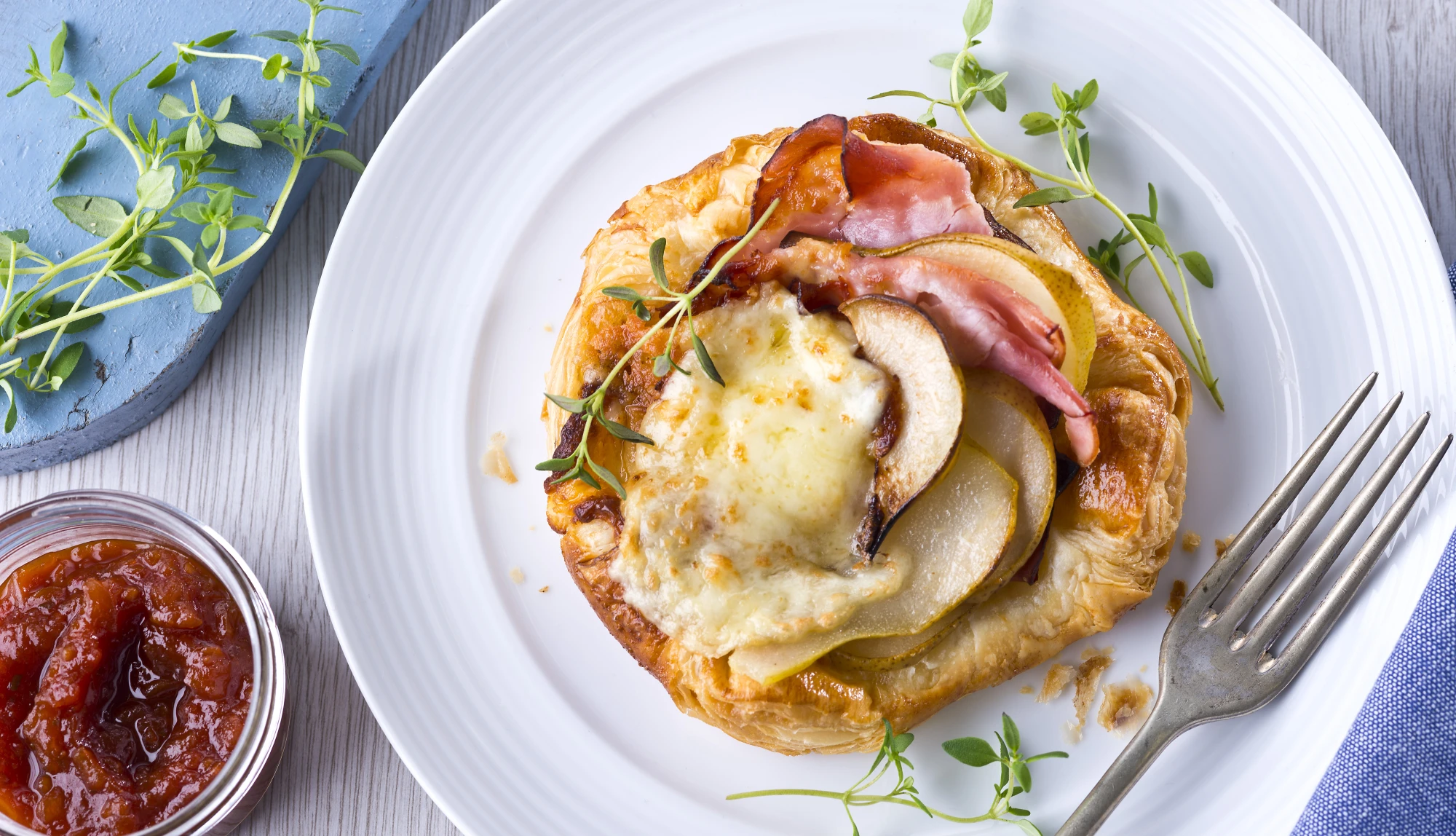 Place the squares onto a large baking sheet and top with slices of brie, pear and ham. Fold in the corner of each square and brush with egg wash.