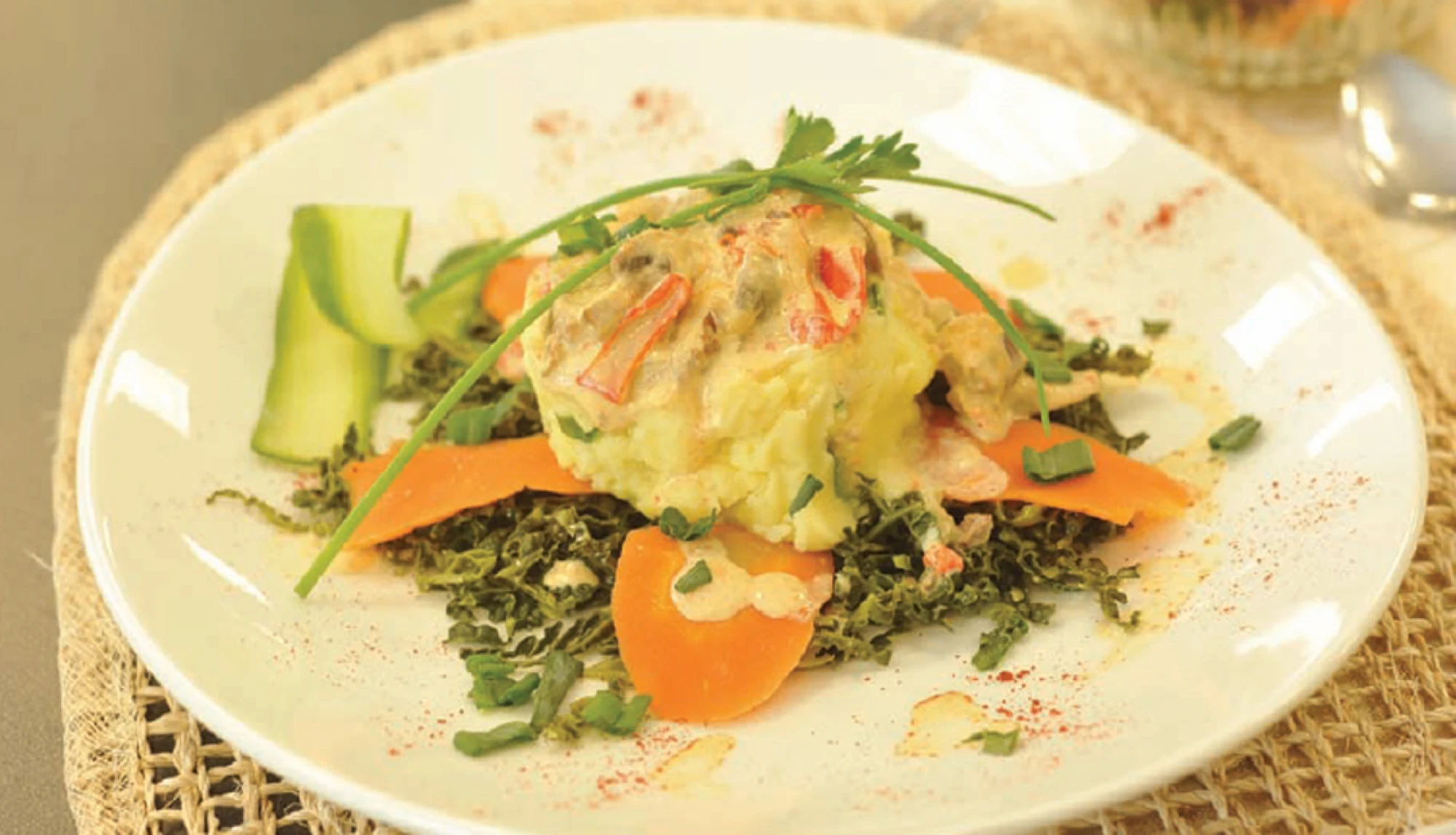 For the champ, cut and wash the potatoes and slice into quarters. Steam the potatoes in a health steamer. Add semi–skimmed milk, butter and fresh chives to the boiled potatoes and mash well.