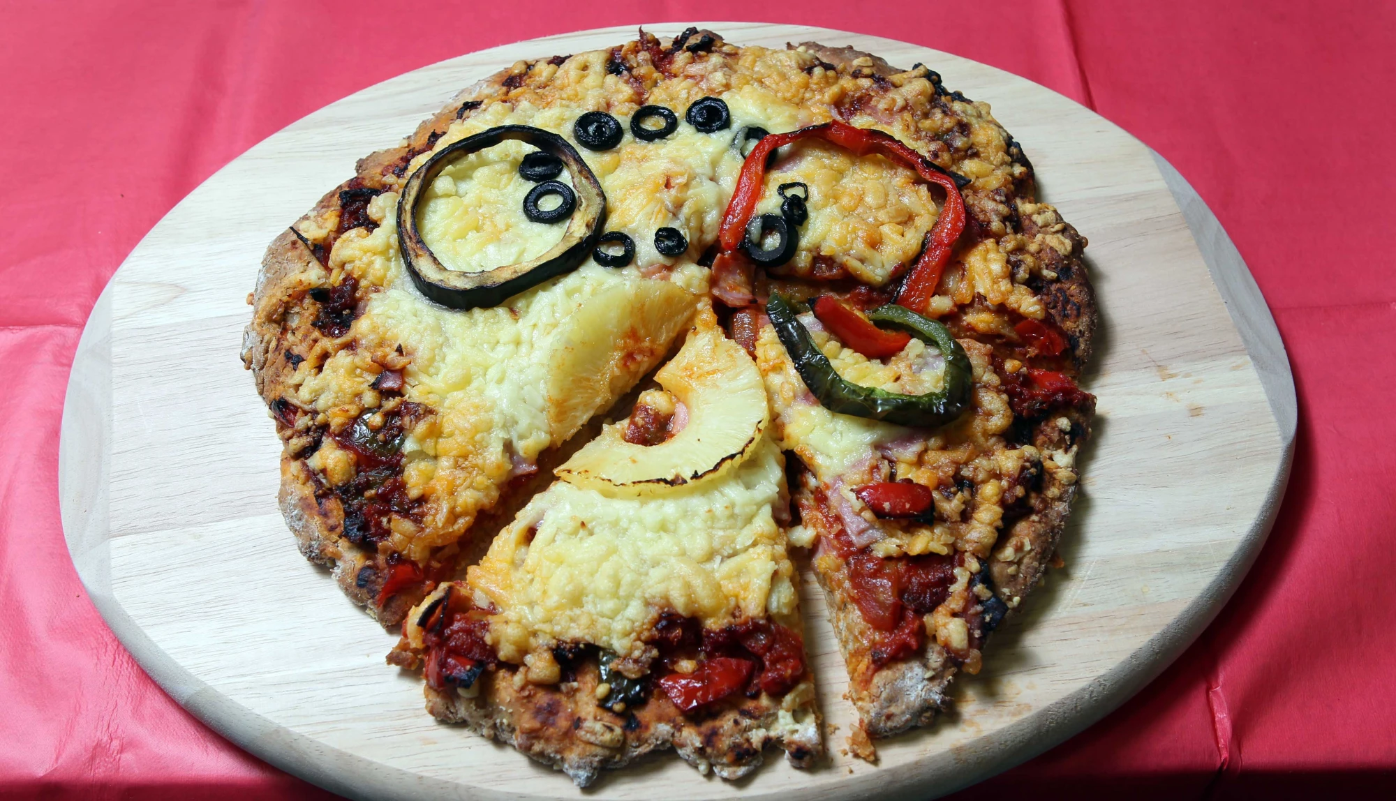 Arrange pineapples, green and red peppers, aubergine and black olives on the top in the order of the Olympic rings. Put in the oven for 25–30 minutes.