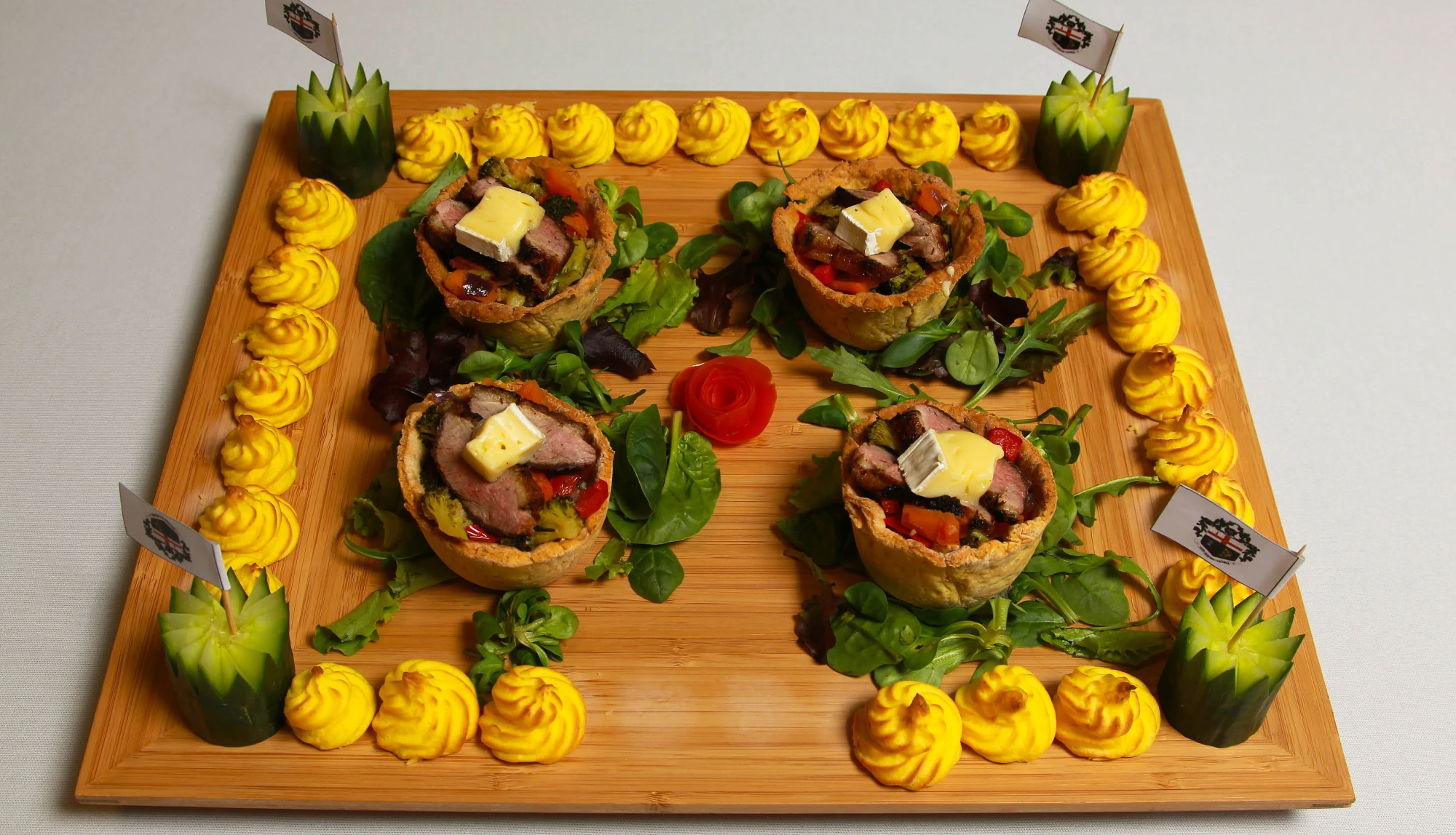 Make white sauce by combining all ingredients in the saucepan and whisking until mixture thickens. Remove pastry shells from ramekin dishes. Cut brie into 8 pieces and put one in each base with sauce. Divide vegetable mixture and sliced duck breast between the four. Top with remaining brie and bake for 15–20 minutes.