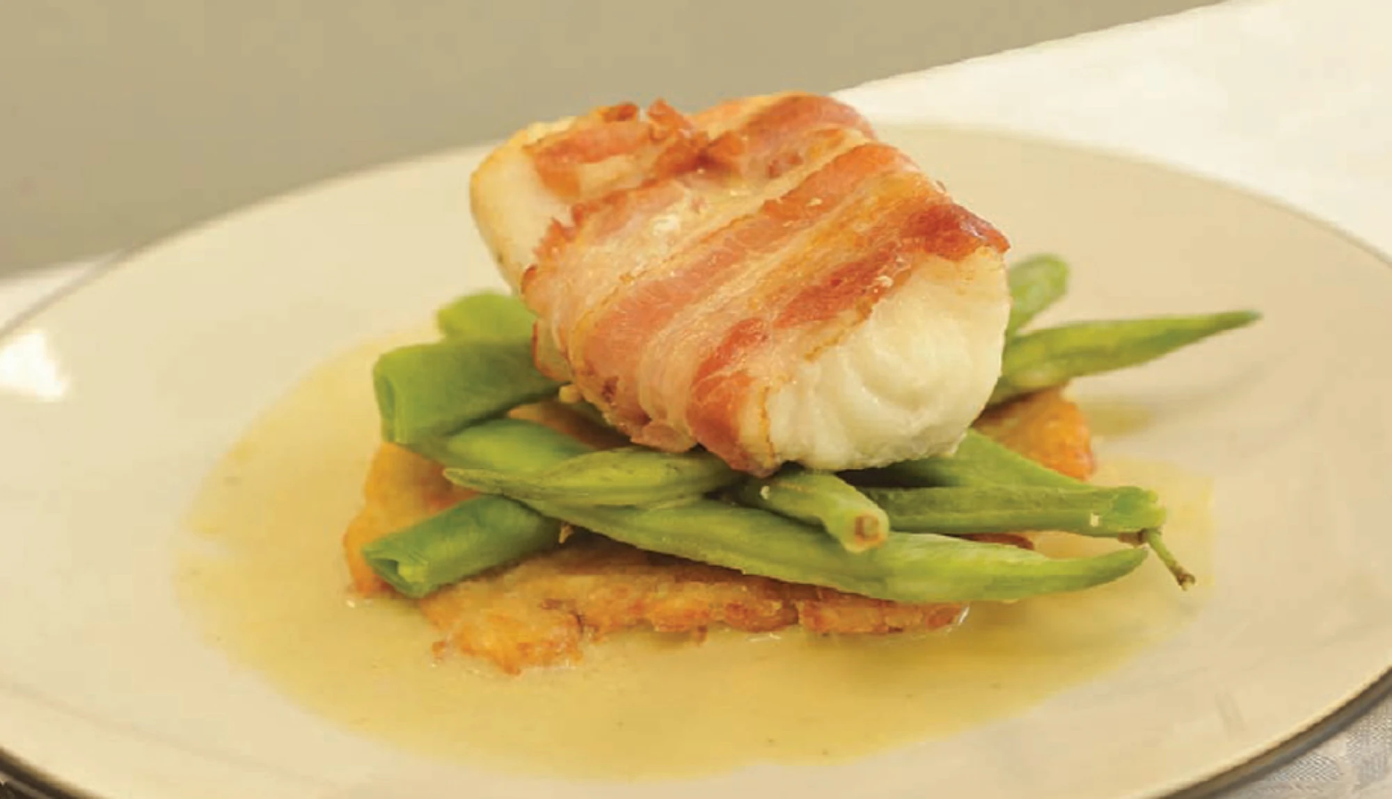 Put the potato cakes into the centre of warmed plates. Spread the green beans on top of the potato cakes and then place the monkfish on top. Spoon around the sauce and serve.