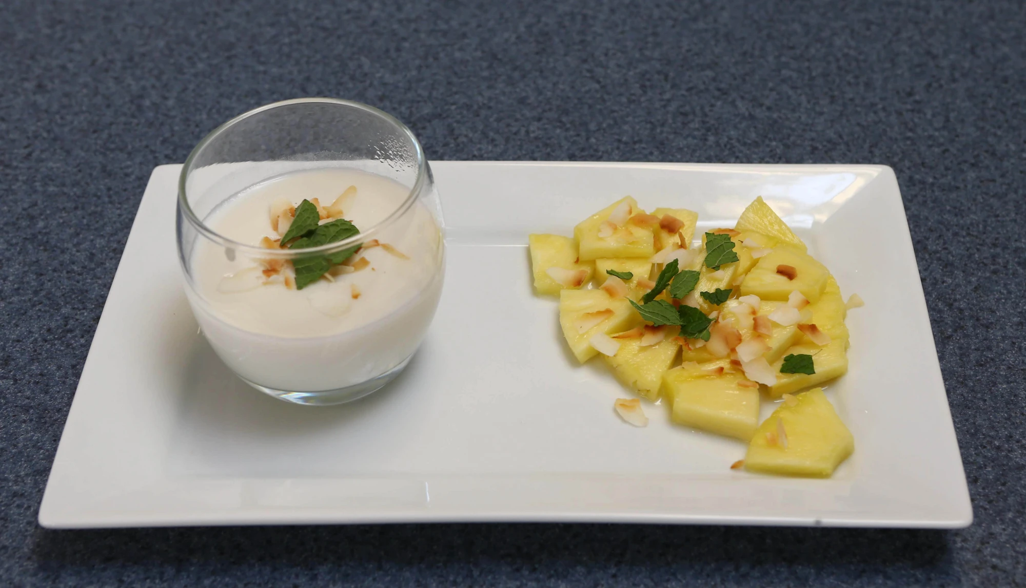 Arrange the pineapple beside each panna cotta. Drizzle with ginger syrup to finish.
