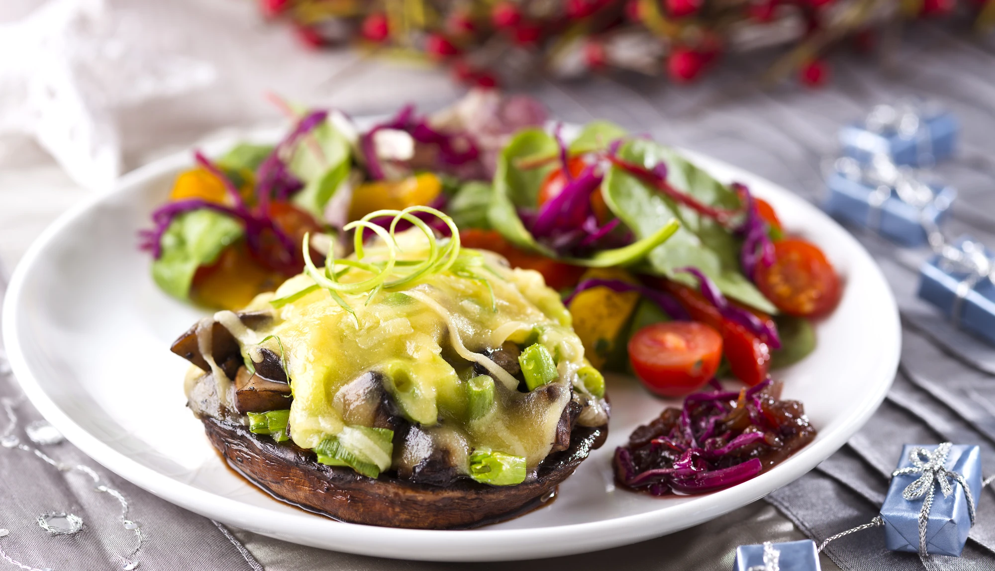 Divide the stuffing among each mushroom. Place onto an oven tray, drizzle a little olive oil on top before roasting for 20 minutes. Serve with salad.