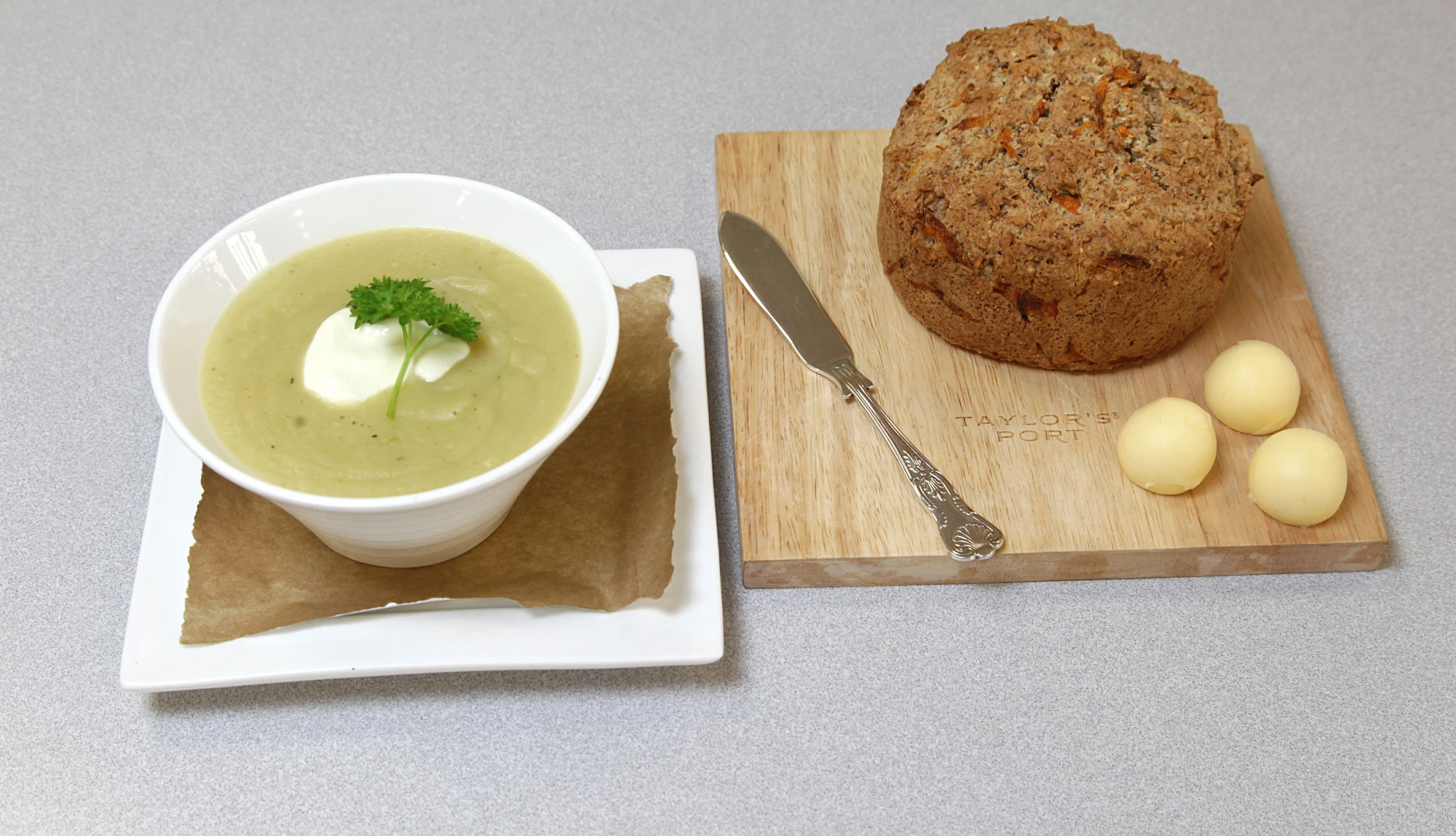 Slice wheaten bread and serve with soup.