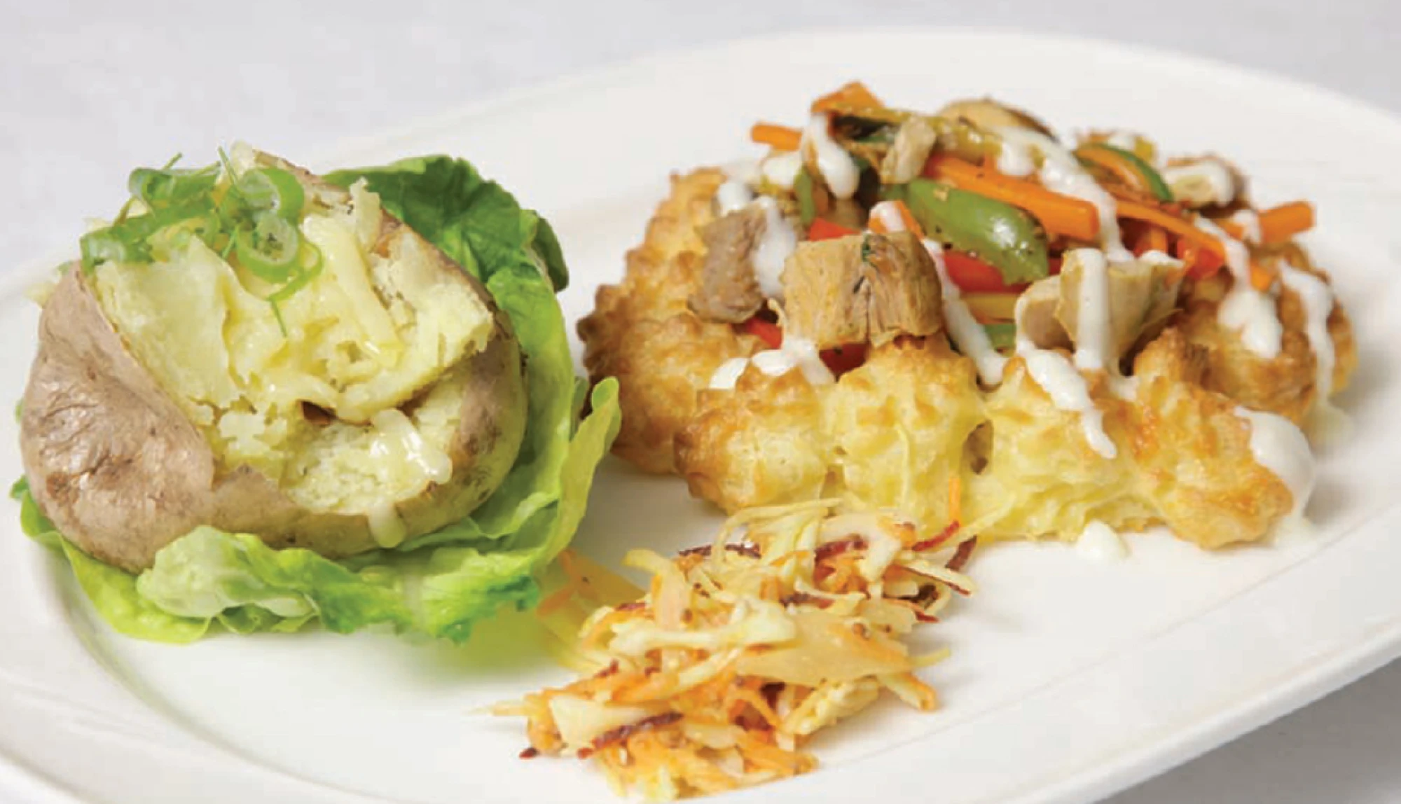 Serving suggestion: baked potatoes with cheese and chives, and coleslaw.