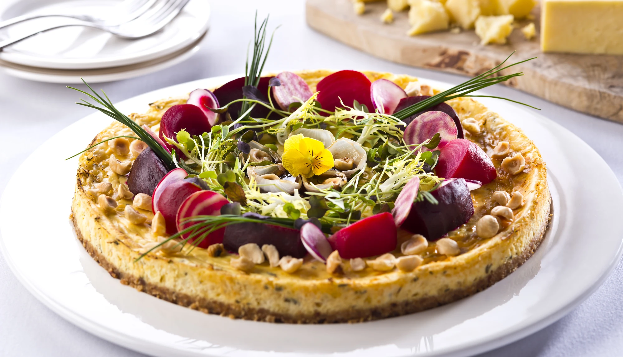 Remove cheesecake from fridge and decorate the cheesecake. First top with rocket, place beetroot and shallots on top then scatter on hazelnuts. Finally, top with balsamic glaze.
