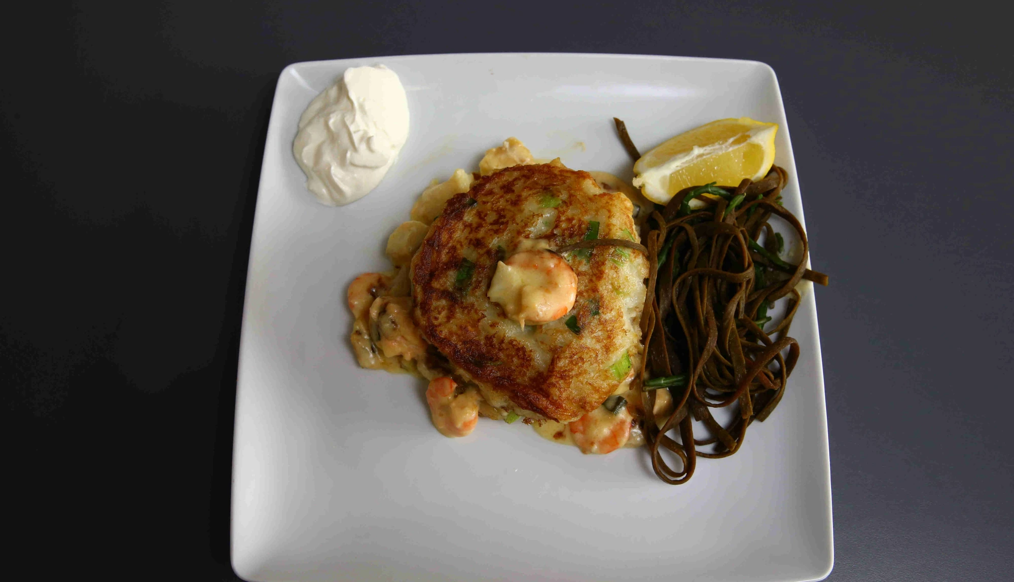For the boxty, peel the potatoes. Grate two of the potatoes and squeeze as much liquid from them as possible using a tea towel. Cut the other two potatoes into chunks and boil for 10 – 15 minutes until tender. Mash the boiled potatoes and then mix in the grated potato, spring onions and flour.