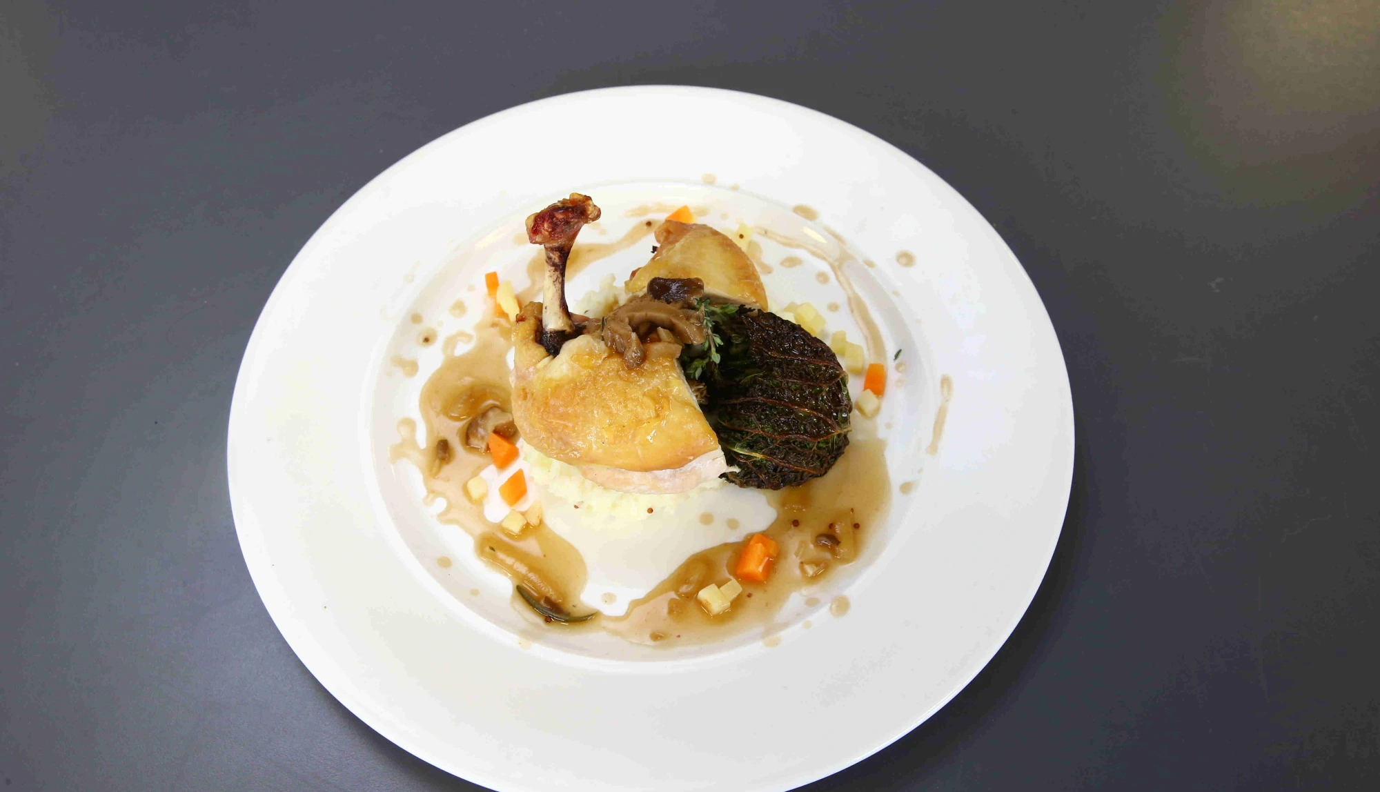 Drain and serve the diced vegetables and place the chicken on top. Add the cabbage ball, gravy and garnish with thyme.