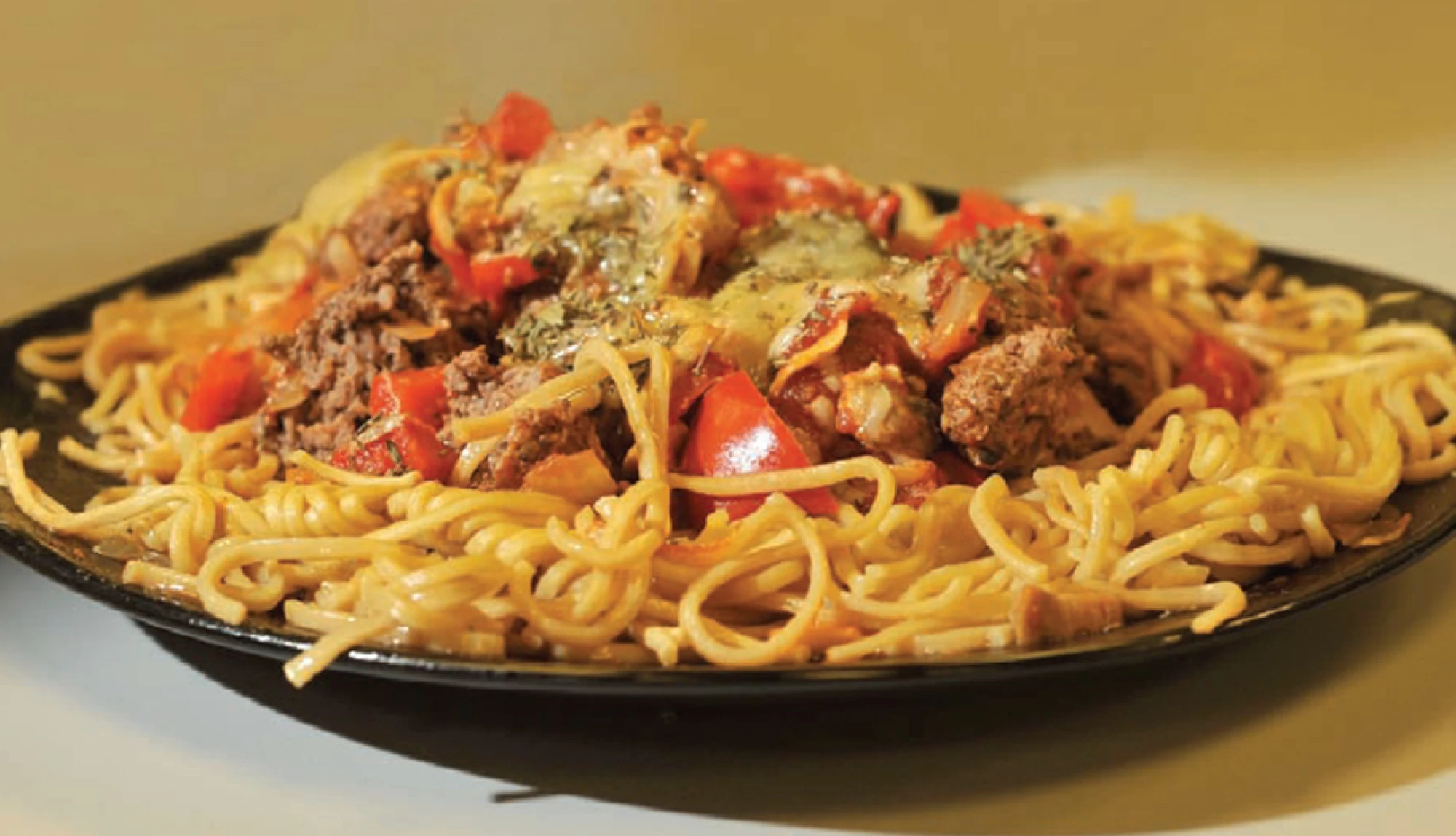 Gently heat oil and sauté all vegetables. Add tomatoes and tomato puree. Heat oil in a non–stick frying pan and prepare meatballs by rolling into even sized balls. Cook gently until brown.