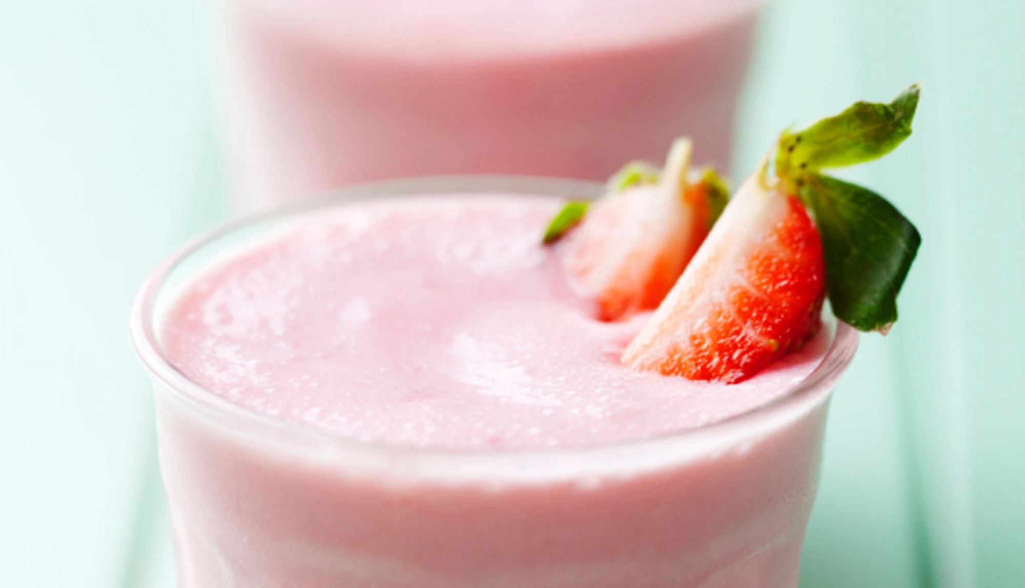 Blend the strawberries and water in a blender until smooth. Pour 1/4 of the puree into the base of two serving glasses