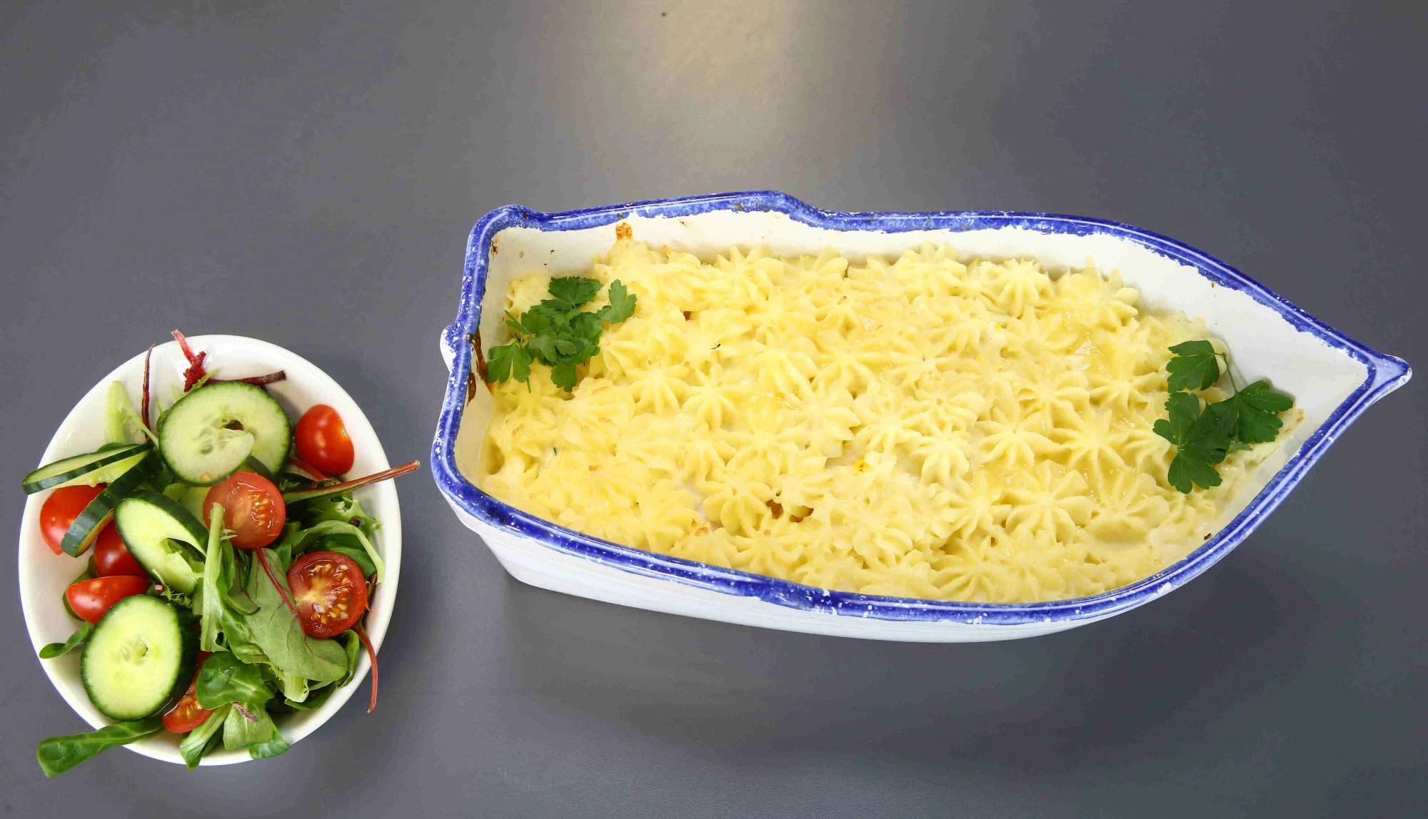 Spoon the potato over the fish mixture starting at the edges before making your way into the centre. Fluff up the potato with a fork and scatter remaining cheese. Place the dish/es on a baking tray and bake in the centre of the oven for about 45 minutes until golden brown.