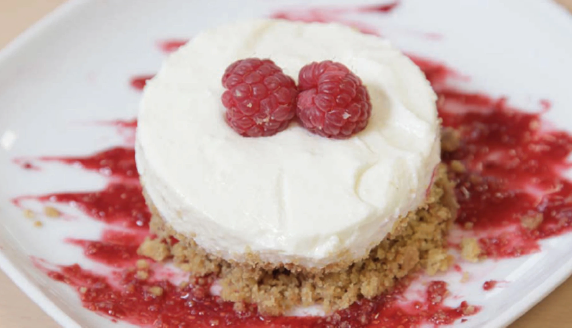 For the cheesecake, crush the biscuits in a plastic bag using a rolling pin. Melt the butter in a saucepan and add the crushed biscuits. Press the biscuits into a container using a tablespoon.