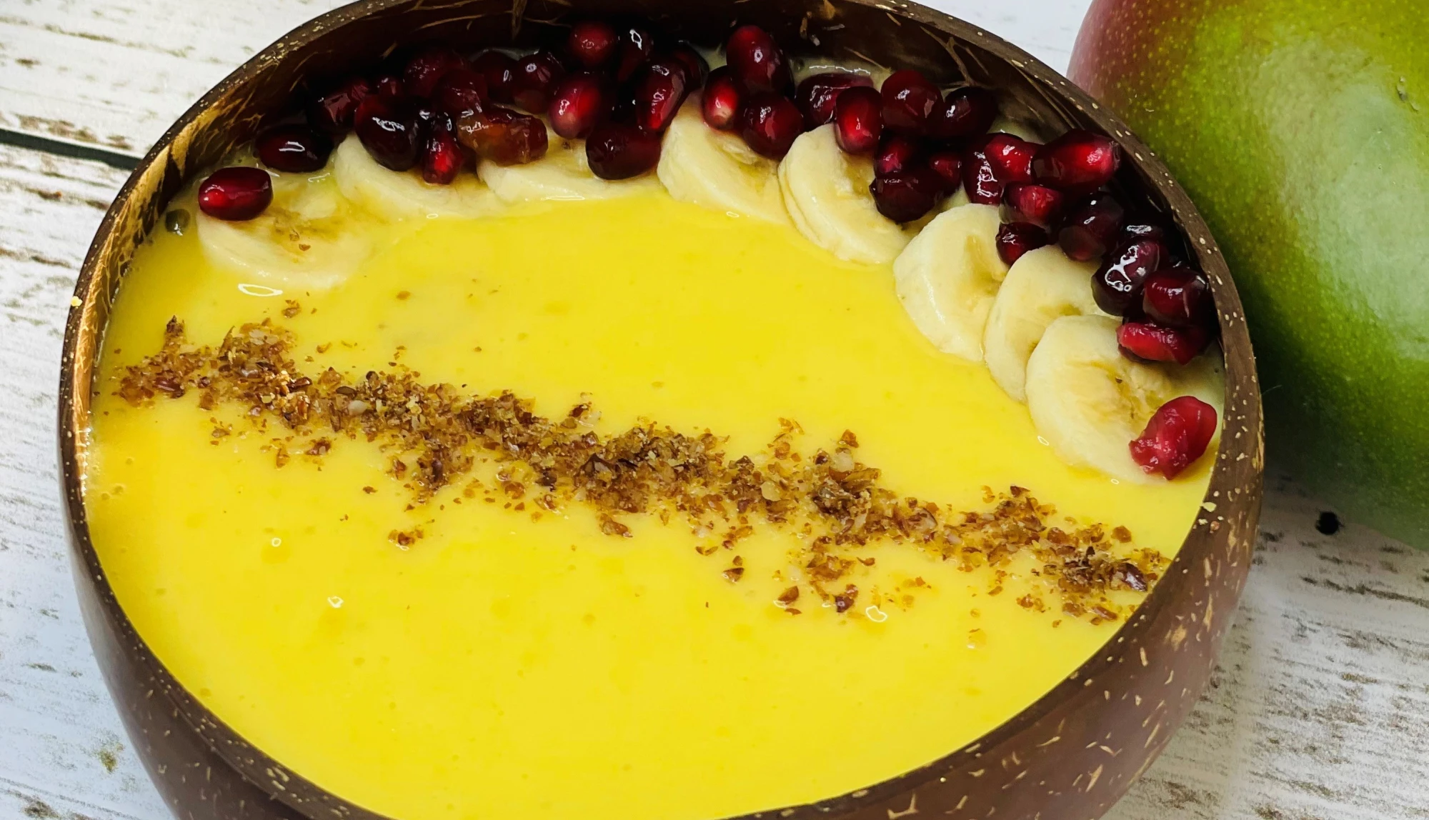 Top the bowl with some crushed nuts, a sliced banana and pomegranate